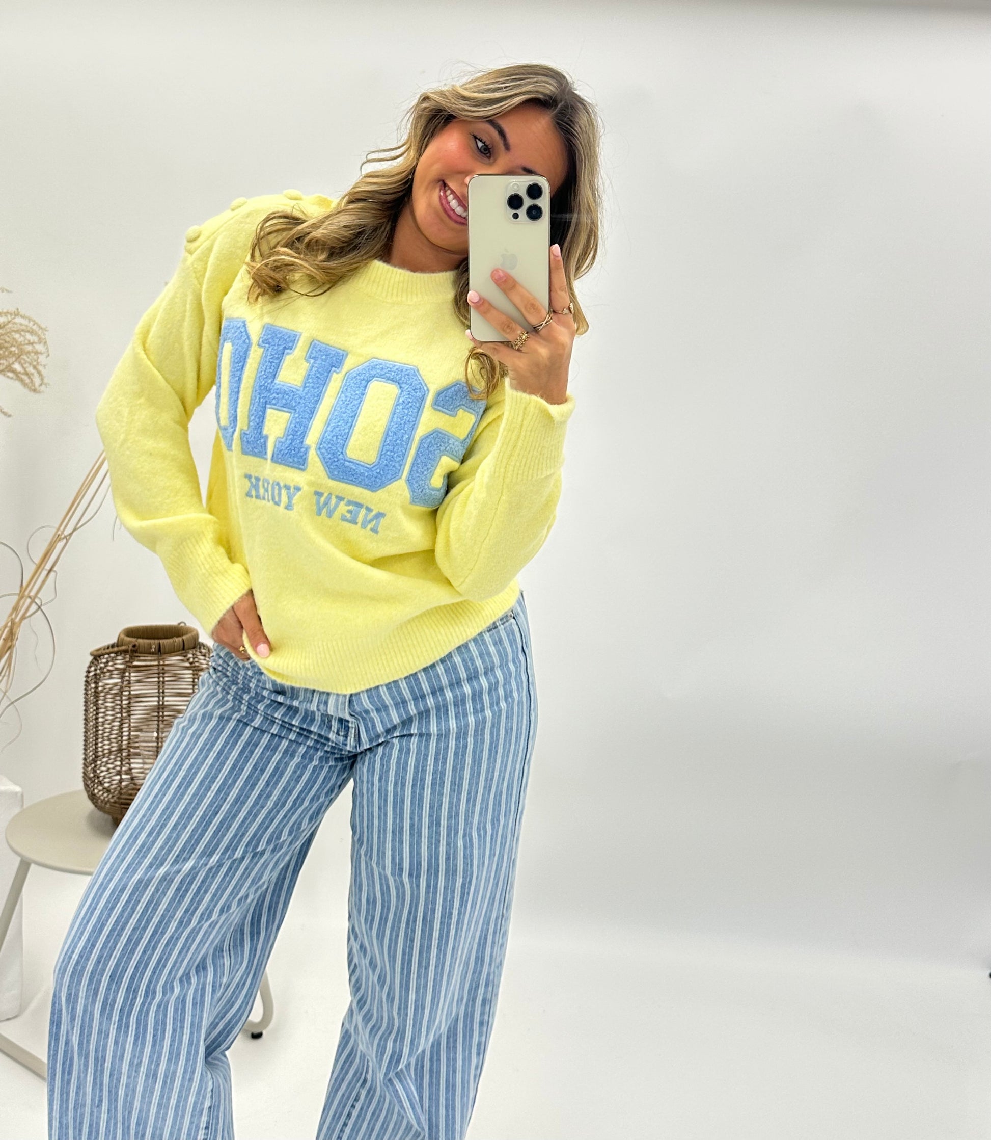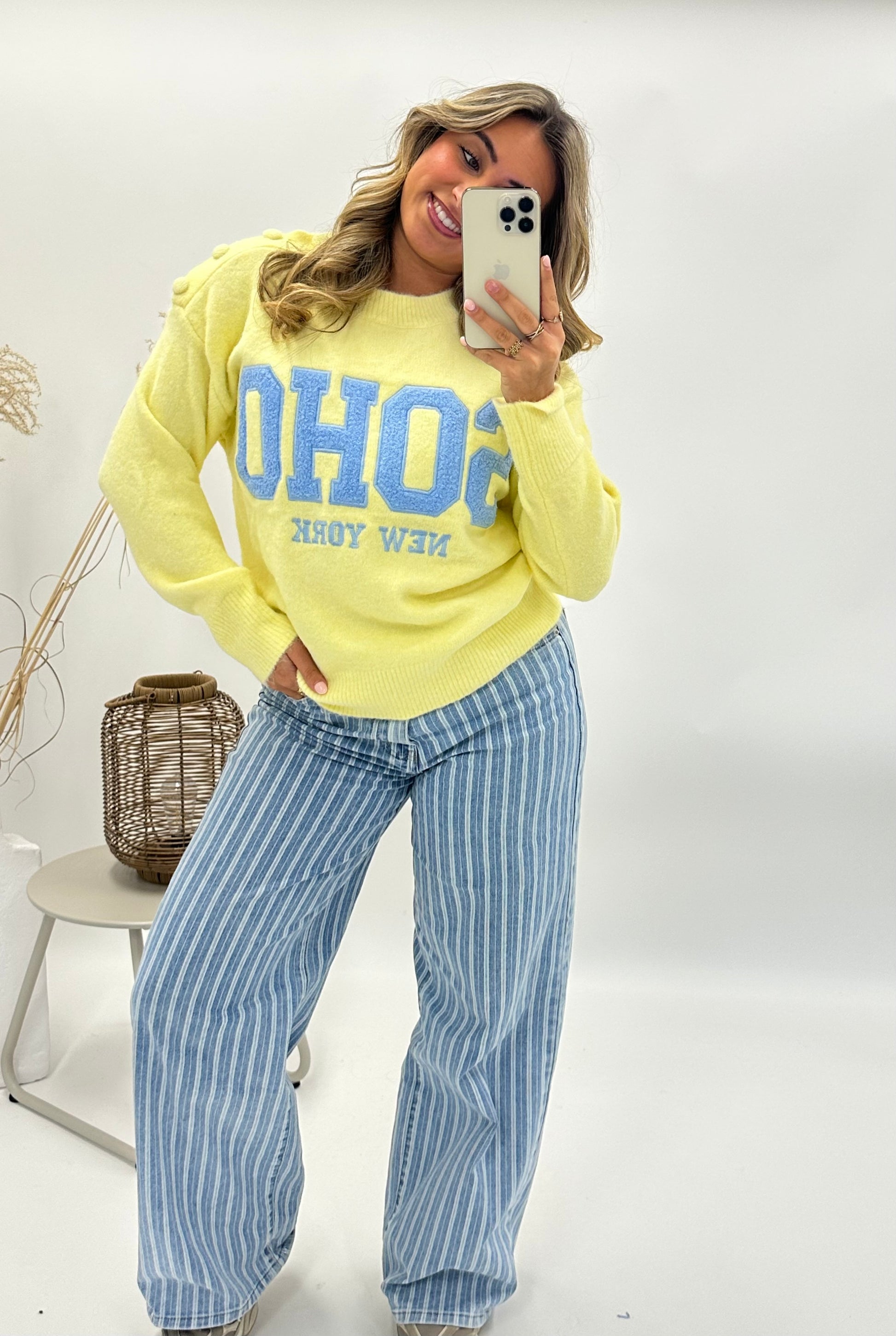 Deze zachte gele sweater geeft je outfit meteen een frisse, trendy uitstraling. De lichtblauwe “SOHO New York” borduring op de voorkant zorgt voor een sportieve maar vrouwelijke touch. De subtiele knoopdetails op de schouder maken het design nét even specialer.