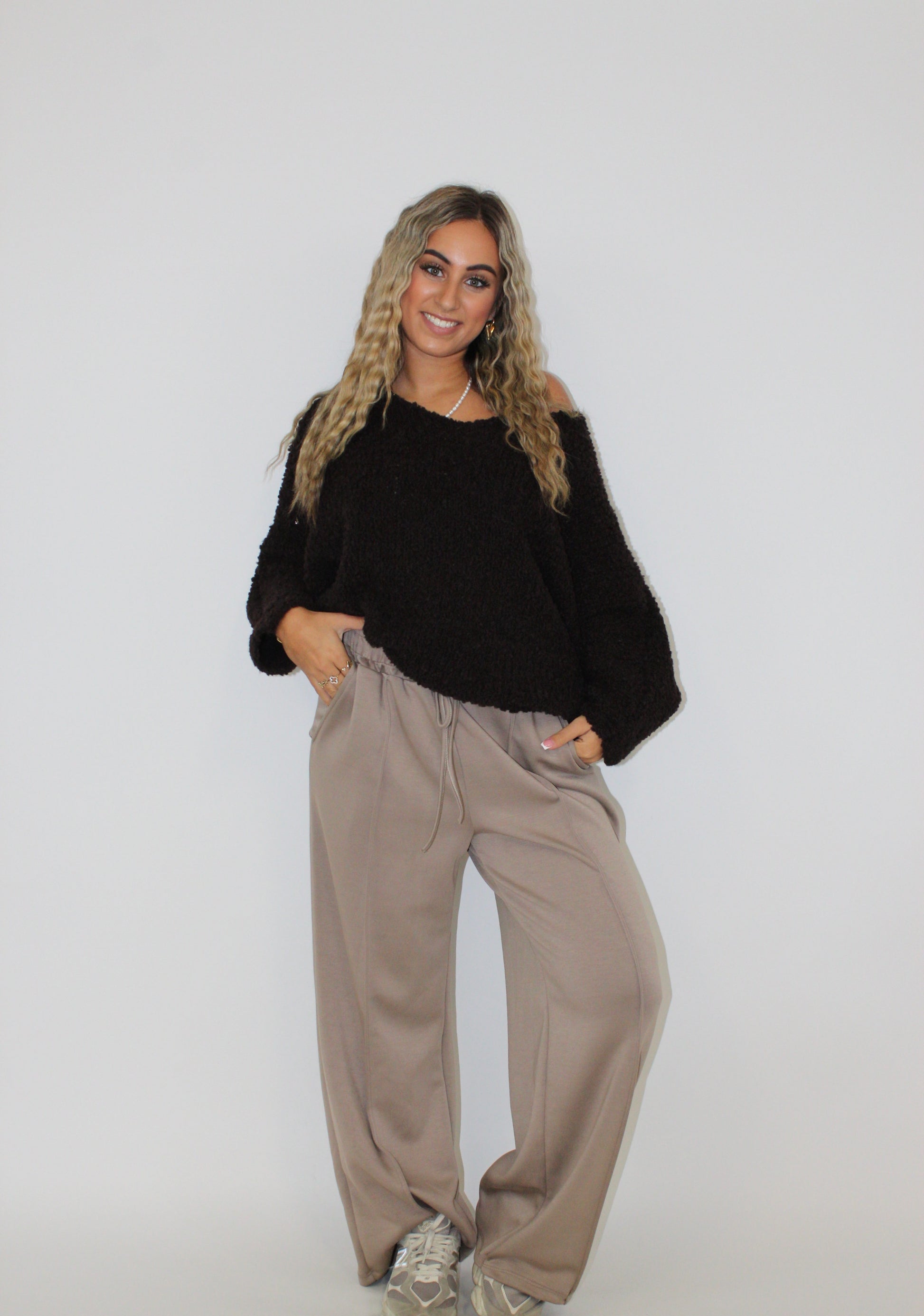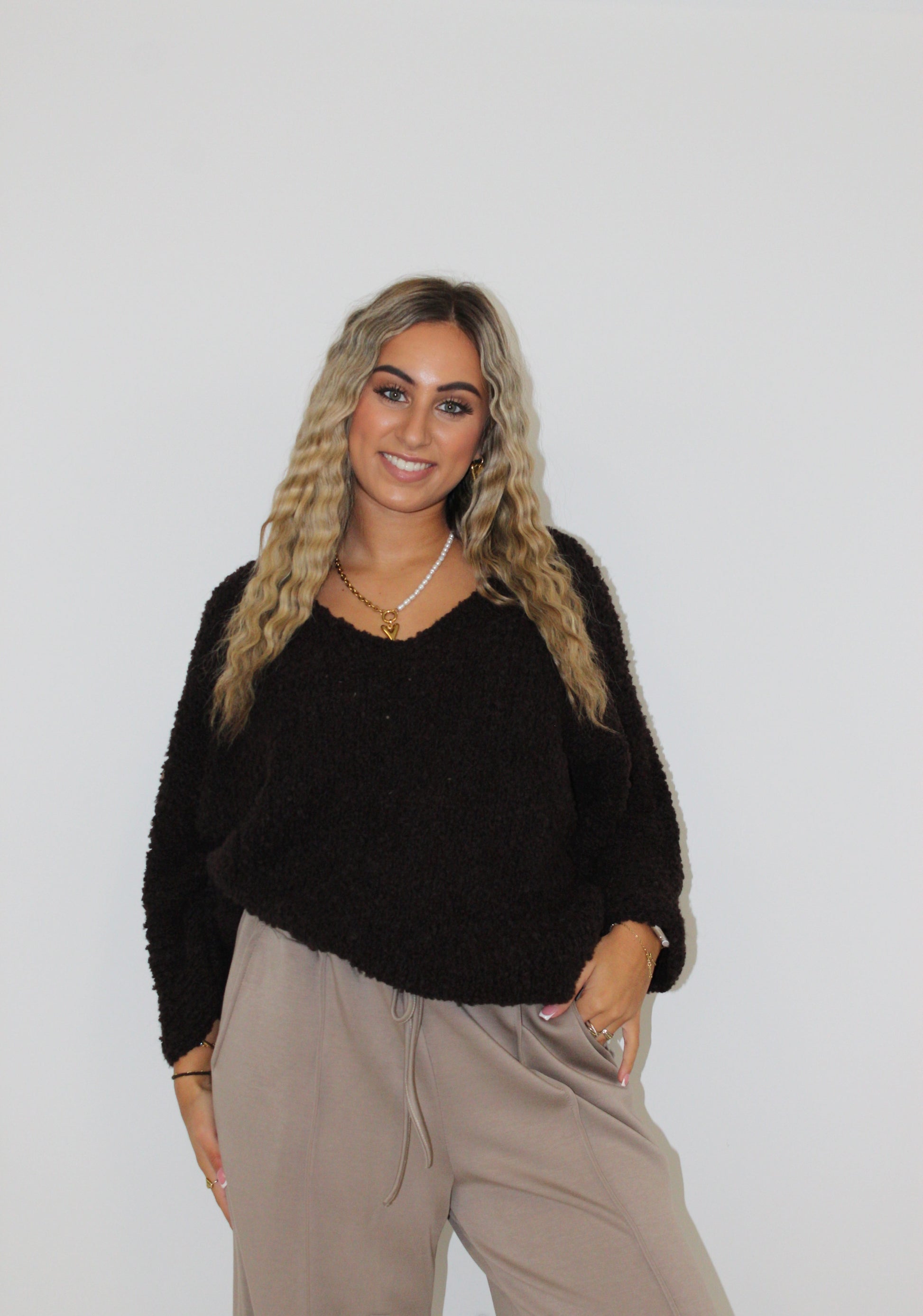 De trui is een heerlijke comfy trui in de kleur bruin met een V hals. Het is zo dikke warme trui en je kunt hem ook beetje off shoulder dragen.