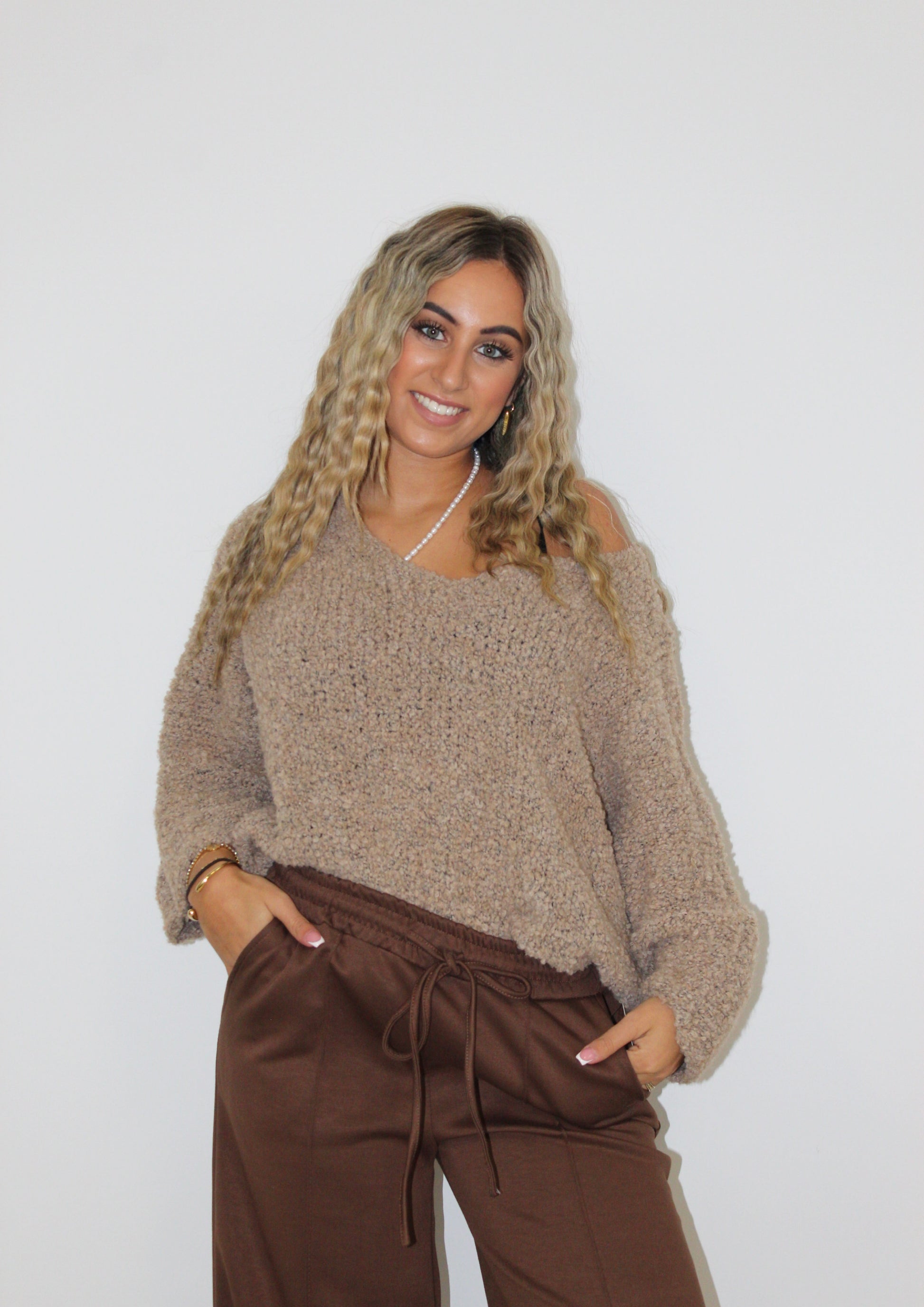 De trui is een heerlijke comfy trui in de kleur camel met een V hals. Het is zo dikke warme trui en je kunt hem ook beetje off shoulder dragen. Leuk te combineren met de jogger Fien.