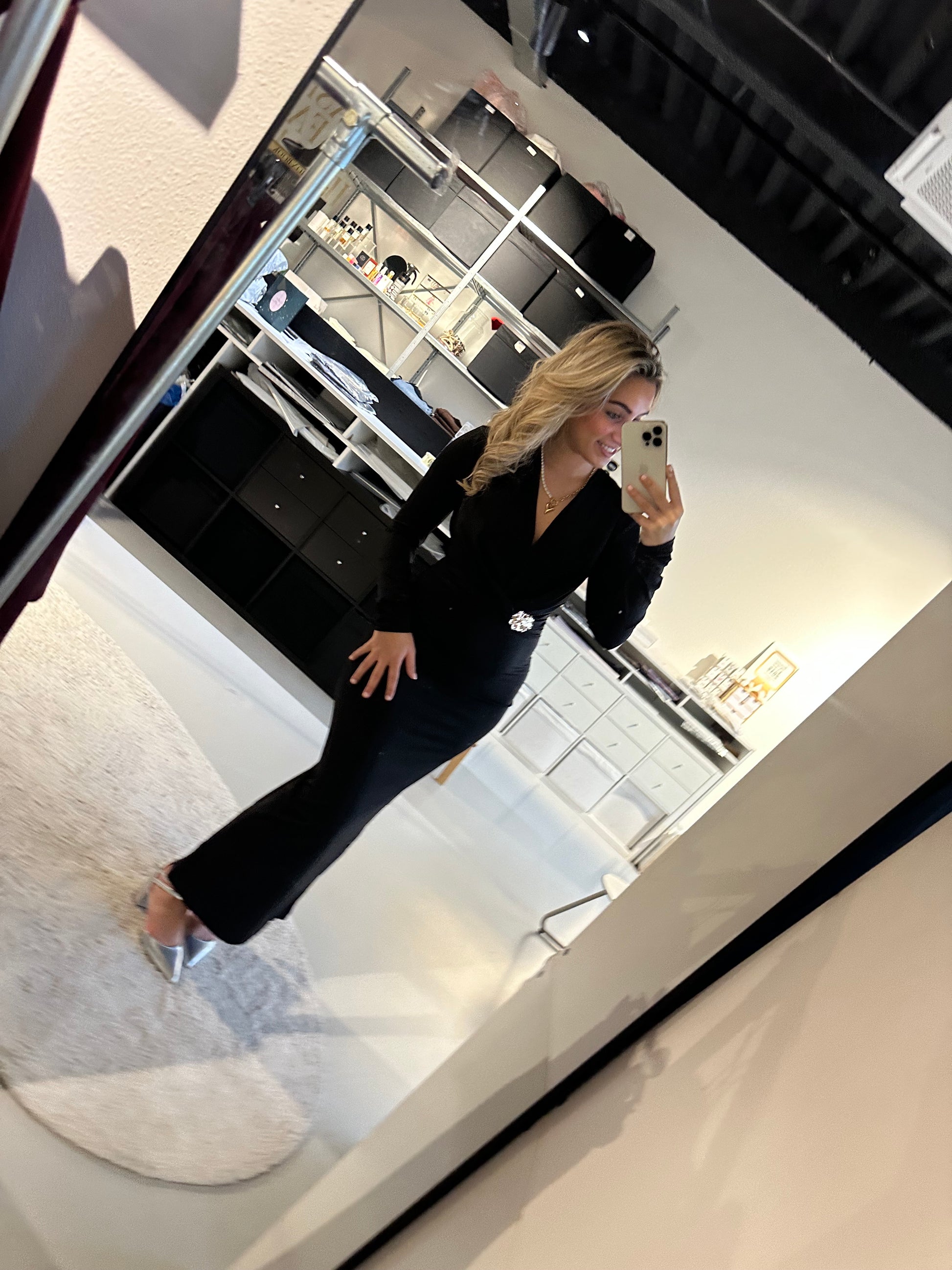 Het is een lekkere stretch jurk. Het model is 1,74 lang. Het heeft lange mouwen en een V hals. Het is in de kleur zwart.