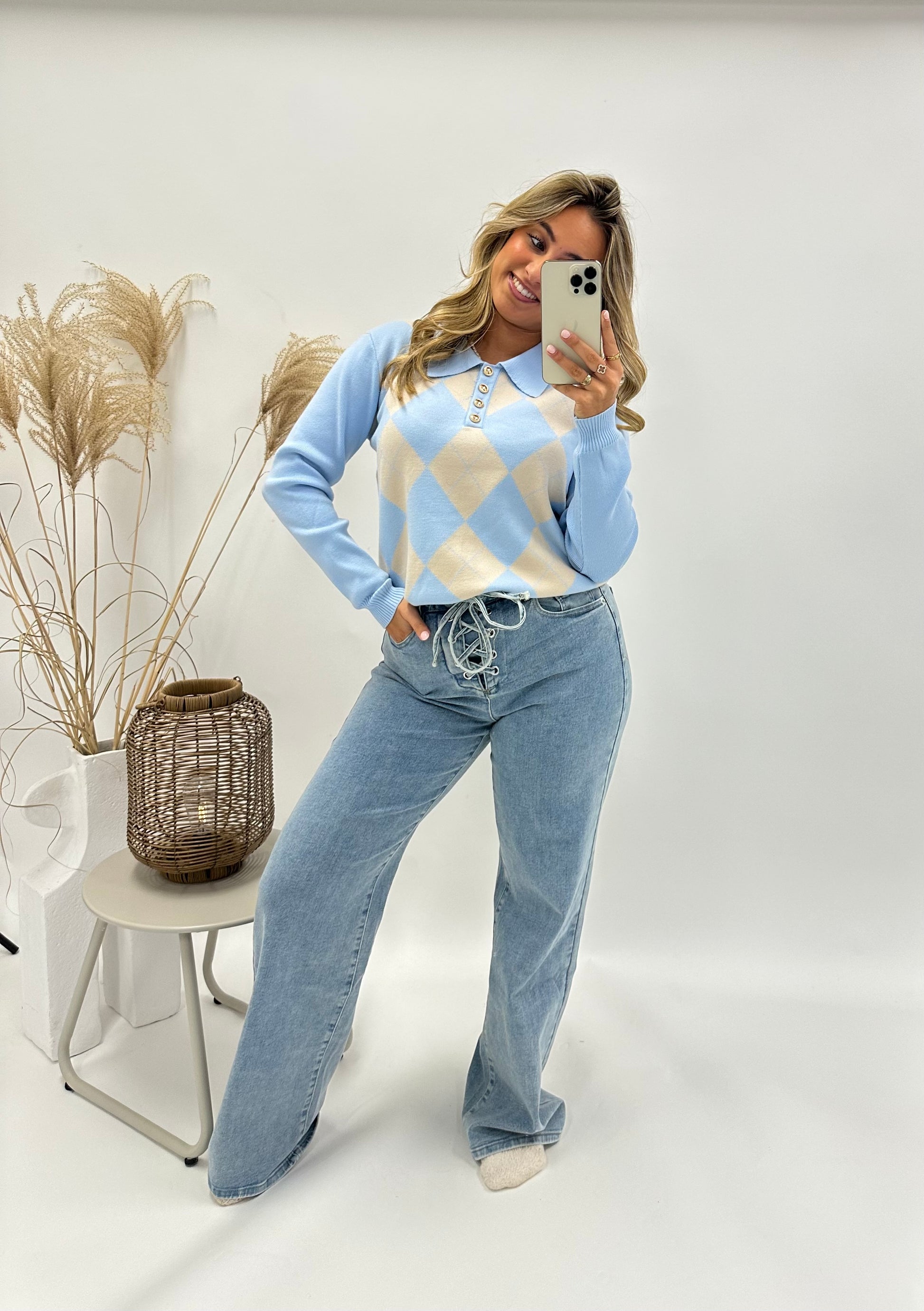 Deze lichtblauwe polo trui met beige ruit patroon geeft een trendy, preppy touch aan je outfit. Het item heeft een klassiek kraagje, een knoopsluiting en is gemaakt van een fijne, zachte knit. De subtiele ruitprint maakt deze trui net even anders dan een basic.
