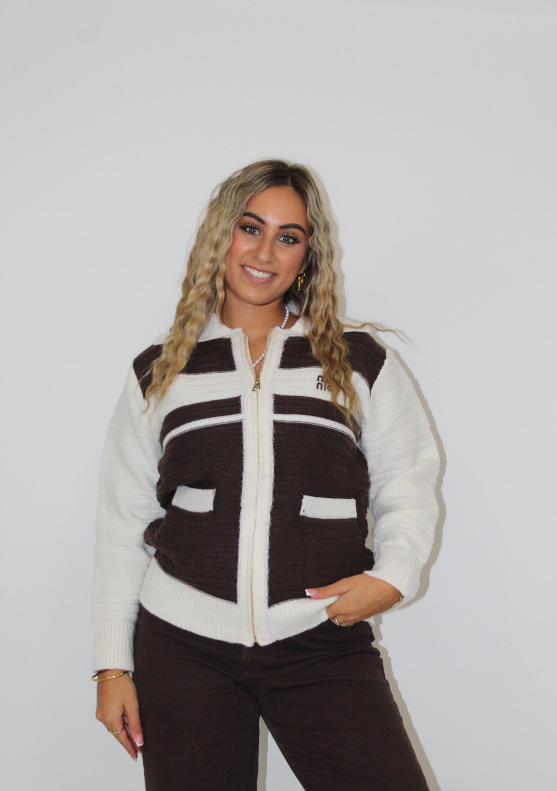 Het is een vest met een gouden rits. In de kleur beige met bruin. Het is een heerlijke dikke stof. Je kunt er een basic topje onder combineren. Kun je bij ons vinden bij de topjes.