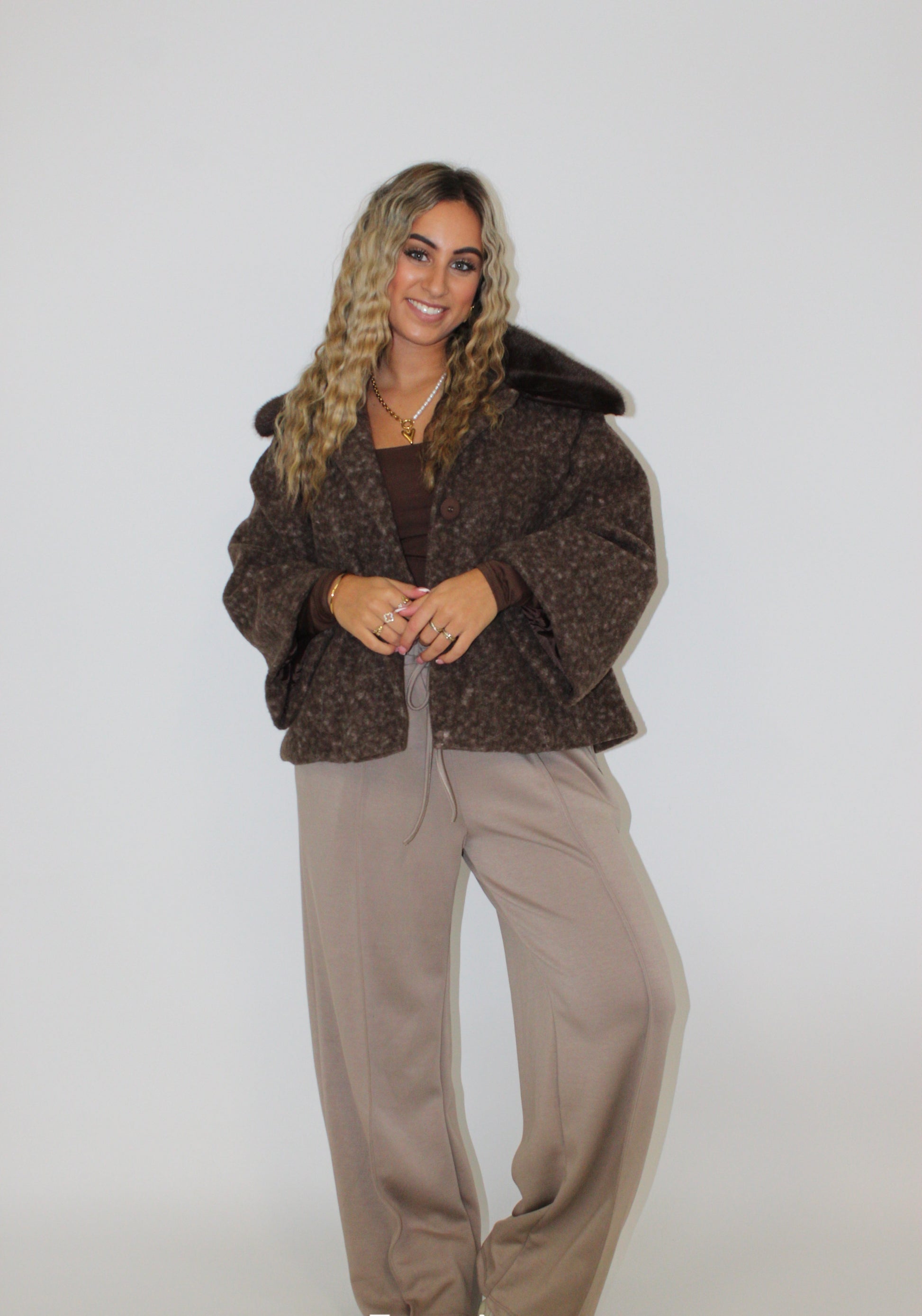 Het is een jasje in de kleur bruin met een marmer look erin. Het heeft een zacht kraagje bij de jas. Het heeft 2 knoopjes om dicht te doen. Het is een leuk kort model, en leuk te dragen voor nu!