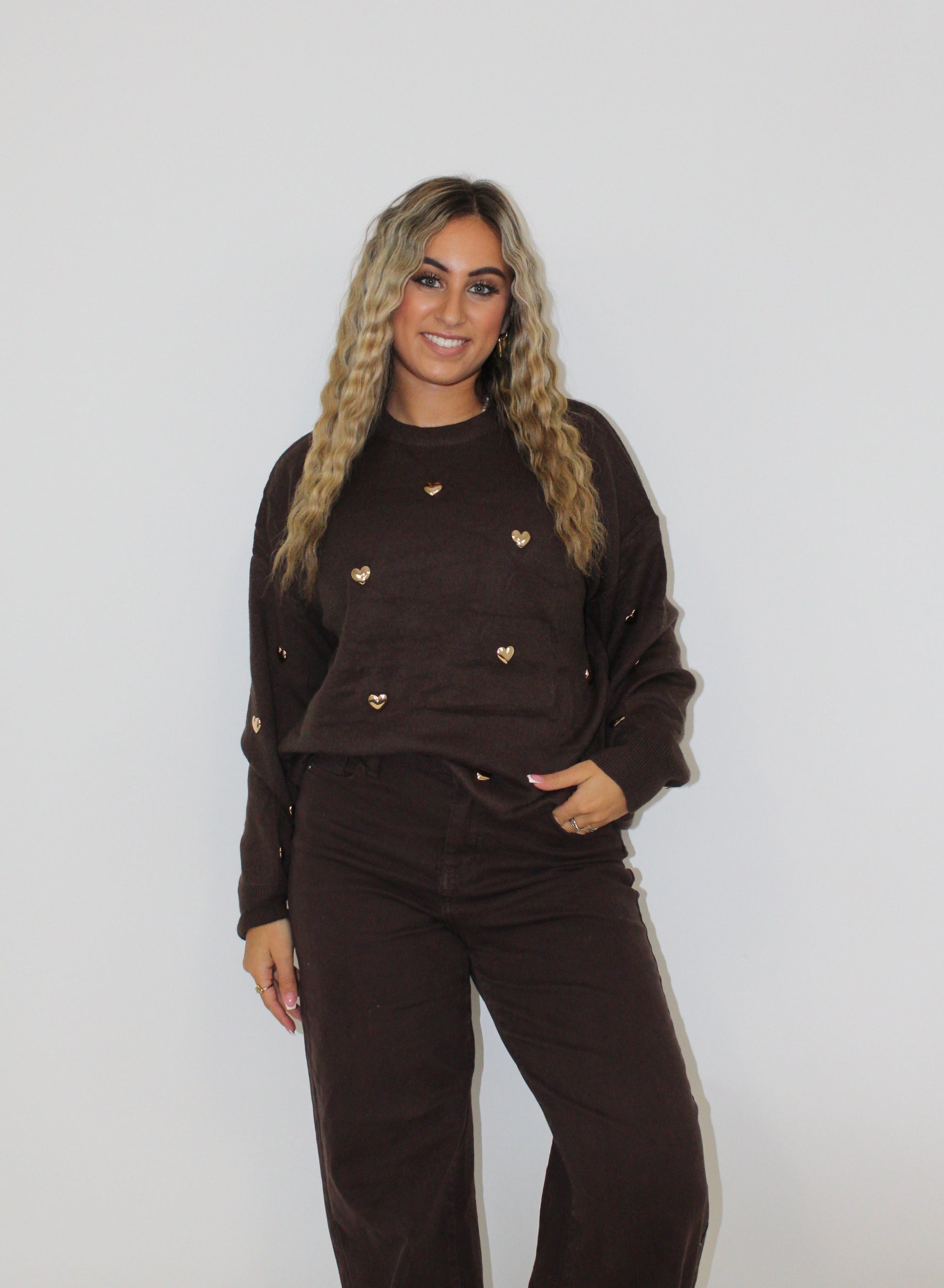 Het is een trui in de kleur bruin met gouden hartjes erop! Het zijn echt broches. Dit kun je het beste handwas wassen. De trui is een lang model, dus draagbaar tot XL. Leuk te combineren met bruine jeans.