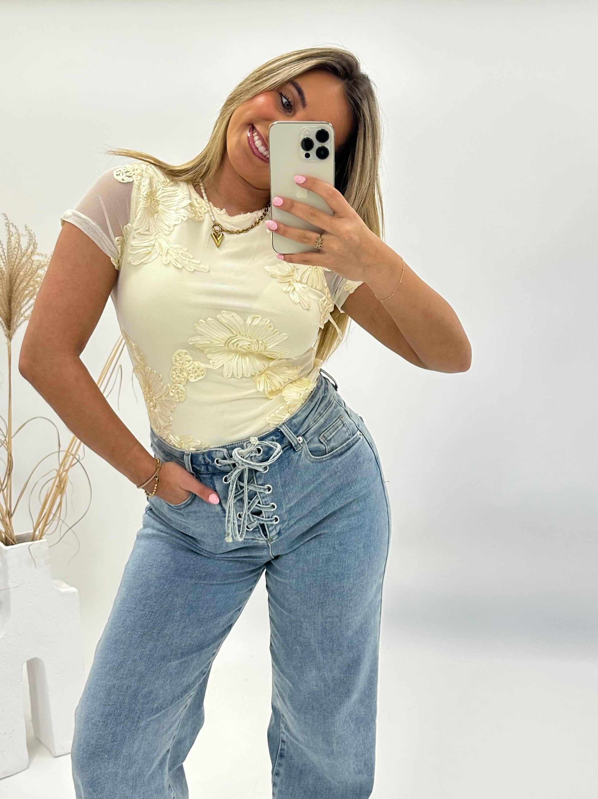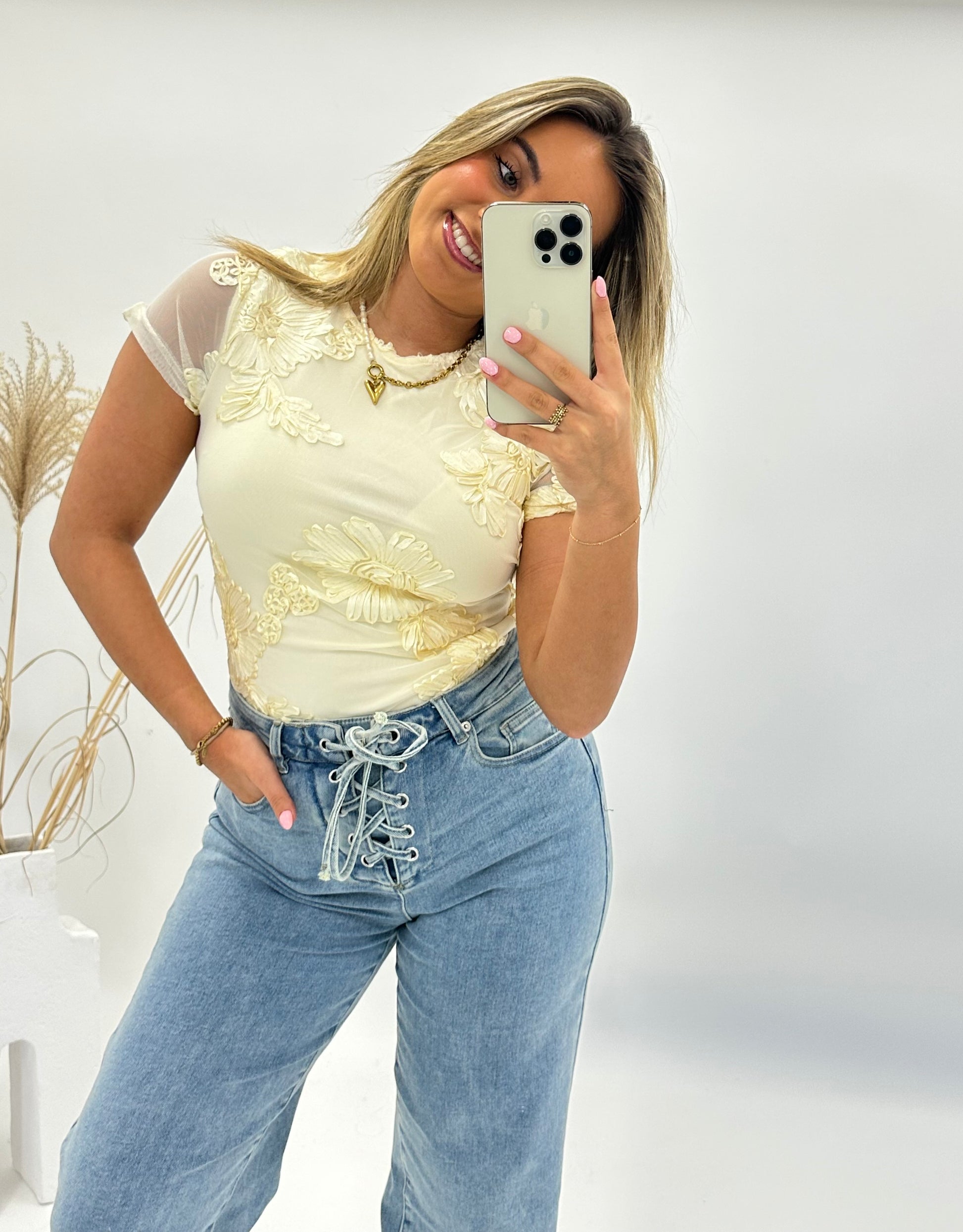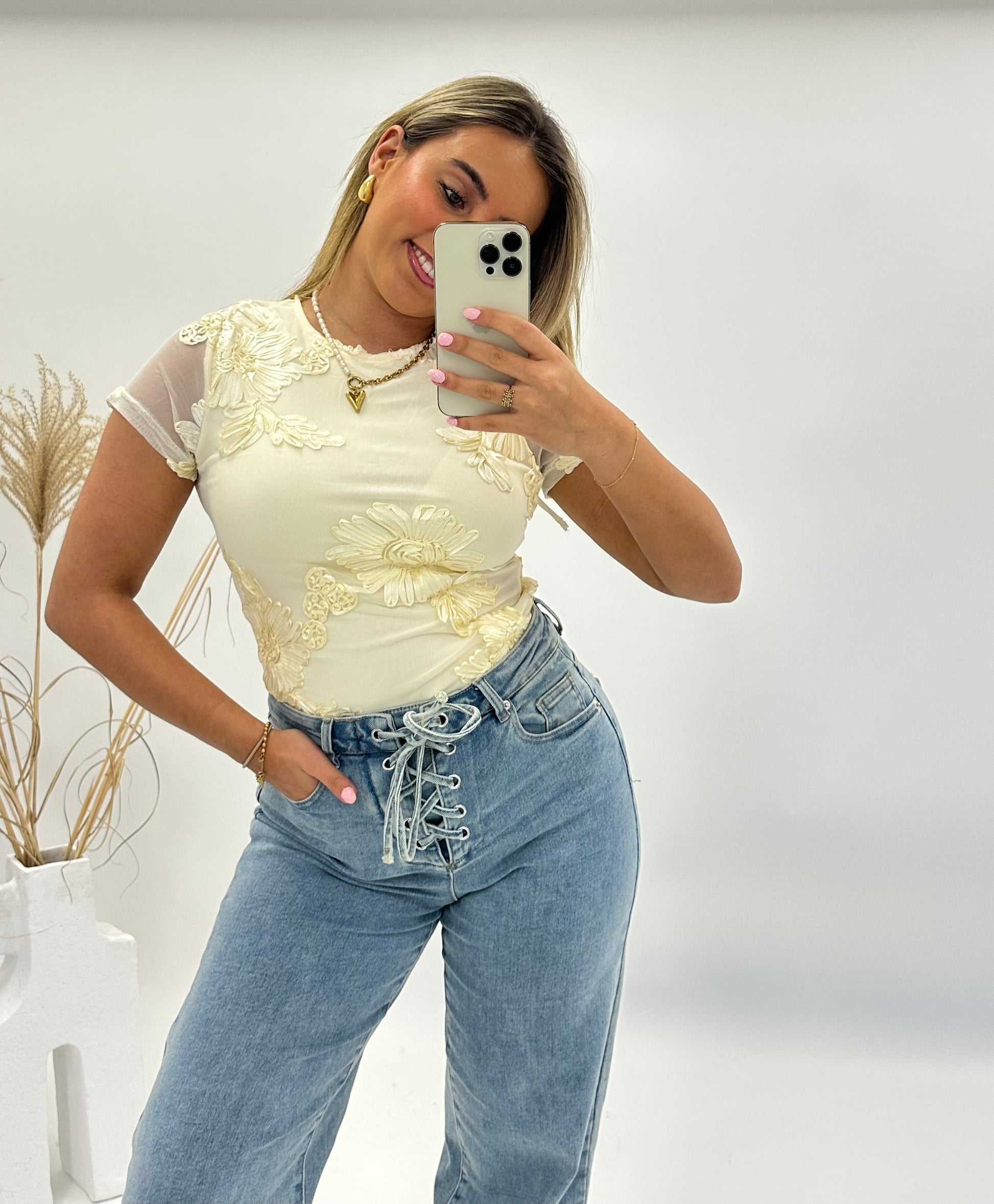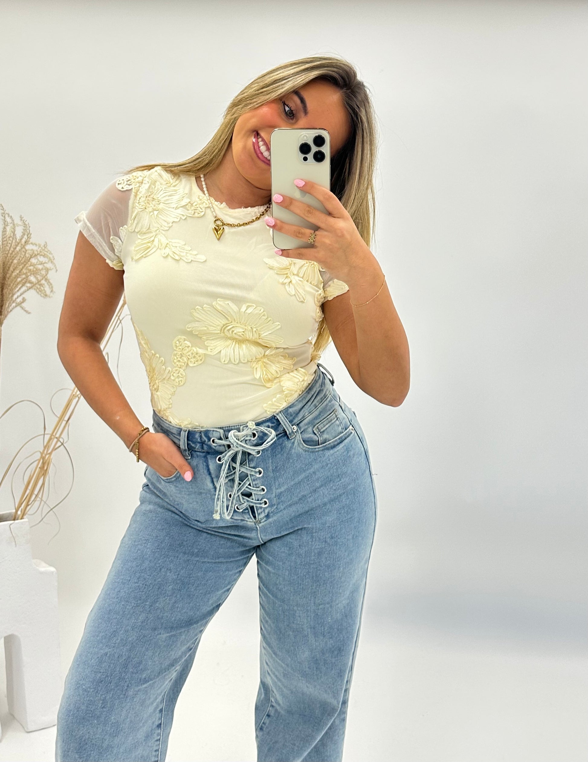 Deze elegante licht gele top is een echte eyecatcher dankzij de glanzende 3D bloemenapplicaties. De semi-transparante stof geeft een luchtige en vrouwelijke uitstraling, terwijl de subtiele glans in de bloemen zorgt voor een luxe effect.
