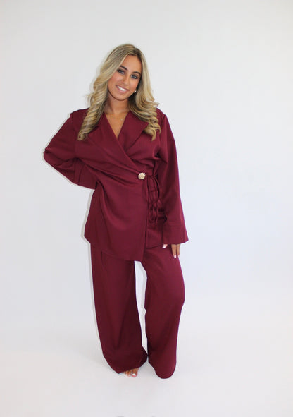 Het is een co ord set in de kleur bordeaux rood. Het heeft een overslag jasje met een gouden detail en ceintuur om te knopen. Het heeft een wijde pijp broek en zit een stretch band in. Je kunt hem met de lengte 1,70 aan.