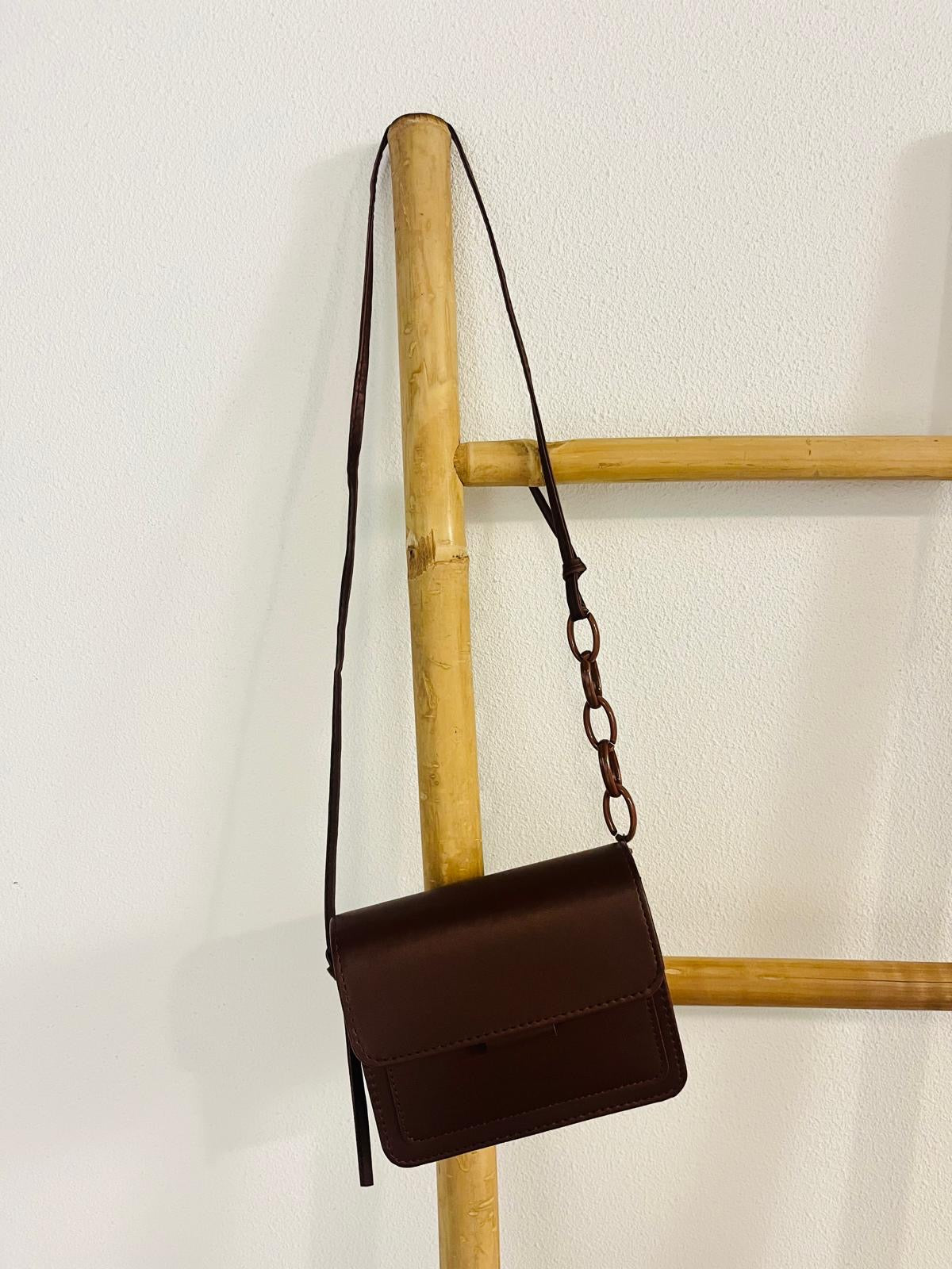Tasje is in de kleur bruin met een connect hengsel wat leuk gemaakt is. Je kunt de band nog verstellen en kan veel in het tasje.